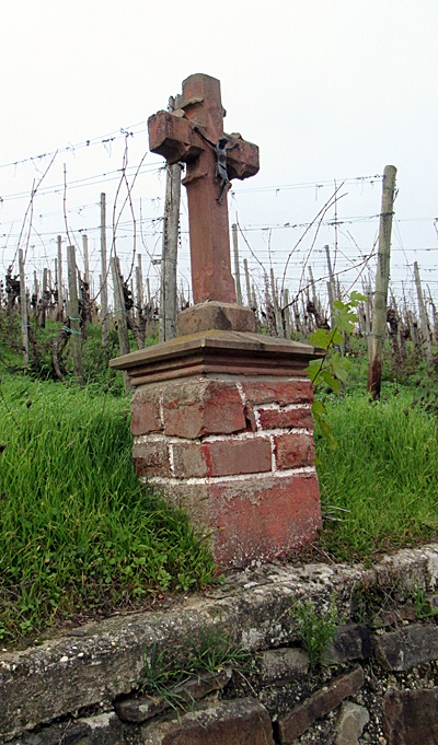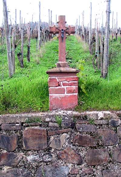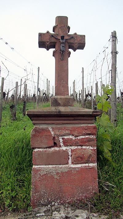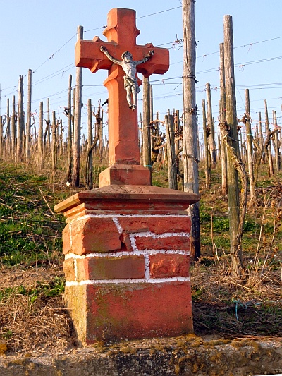 Sockelkreuz auf Weinbergsmauer, Rotsandstein, mit Korpus. [1]