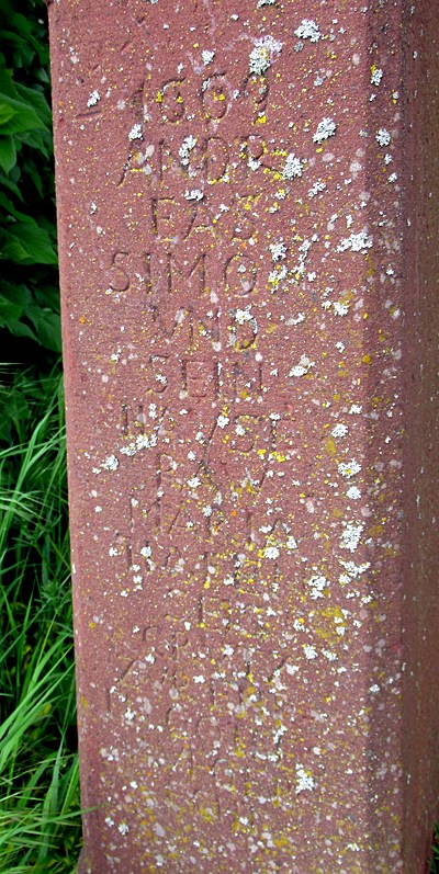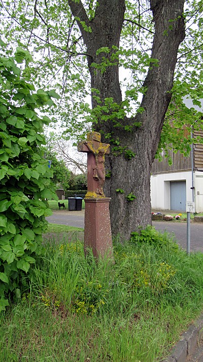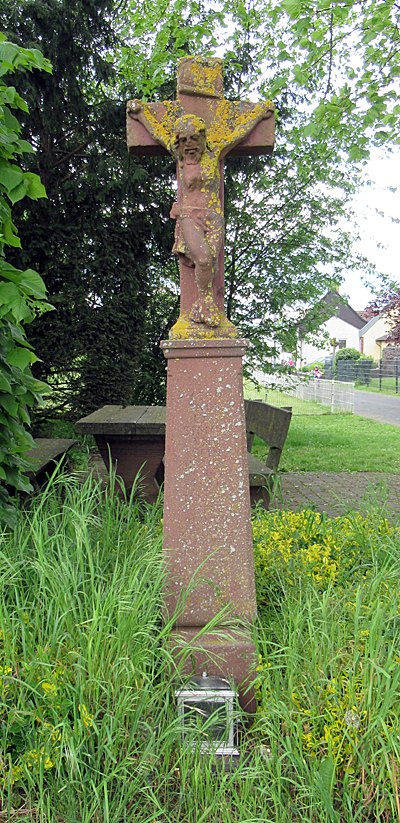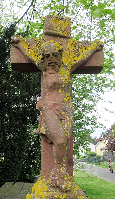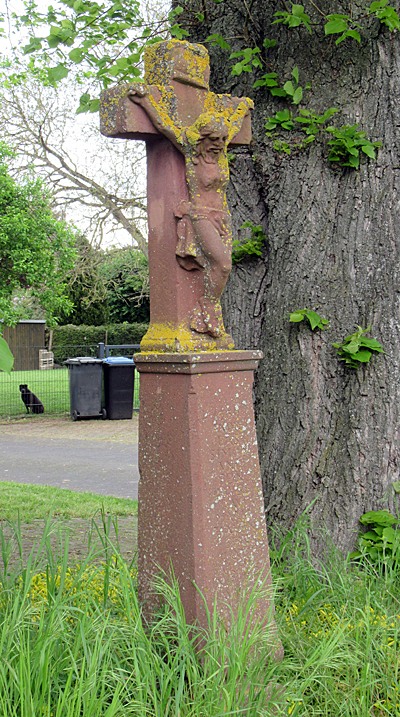 Schaftkreuz, Rotsandstein, mit reliefiertem Korpus.