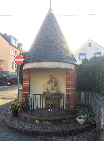 Ein altes, undatiertes Heiligenhäuschen stand lange vorher an dieser Stelle. Es war mit einem einfachen Gitter verschlossen. Nachdem es sehr baufällig geworden war, hat man es 1973 durch das heutige, runde Kapellchen ersetzt, welches von einem spitzen Schieferdach gekrönt wird.