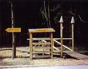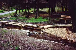 Beim Parkplatz der Grillhütte am Waldeingang (von Schillingen aus in Richtung Fleschfelsen). Erlebnispfad, auf dem der barfussgehende verschiedene Untergründe (trockene und in einem Bach gelegene) erkunden kann.