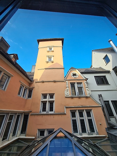 Hinter Steipe und Rotem Haus, einen engen und malerischen Hof umschließend, das unzerstört gebliebene Haus Zum Hirtzhorn (= Hirschhorn) mit quadratischem Treppenturm, der 1559 bezeichnete Sturz (Kopie) mit Wappenschilden und Spruchband. [2]