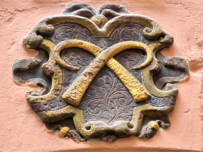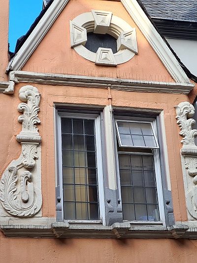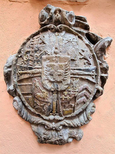 Das kurfürstliche Wappen im Innenhof der Steipe an der Hinterfront des Roten Hauses befindet sich dort erst seit dem 19. Jahrhundert. Hotelier Josef Becker ließ es als Wandschmuck einbauen. [3]