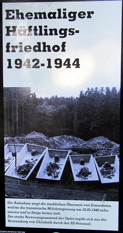 1946 exhumierte eine französische Kommission die Opfer aus den Massengräbern und aus den Gräbern des versteckt am Waldrand befindlichen "Lagerfriedhofes", auf dem die SS die Toten würde- und namenlos hatte verscharren lassen. Identifizierte französische und luxemburgische Opfer wurden auf Friedhöfe in ihrem Heimatland umgebettet. Die Toten, die nicht identifiziert oder die nicht in ihre Heimatländer überführt werden konnten, wurden auf dem neu angelegten Gedenkstätten-Friedhof beigesetzt. [1] [2]