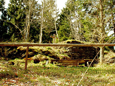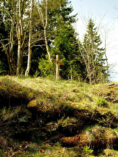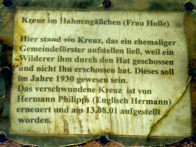 Hier stand ein Kreuz, das ein ehemaliger Gemeindeförster aufstellen ließ, weil ein Wilderer ihm durch den Hut geschossen und nicht Ihn erschossen hat. Dieses soll im Jahre 1930 gewesen sein. Das verschwundene Kreuz ist von Hermann Philipps (Englisch Hermann) erneuert und am 13.08.01 aufgestellt worden. [1]