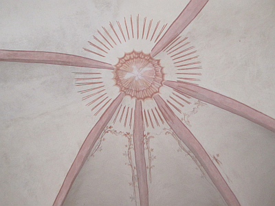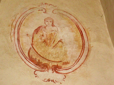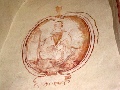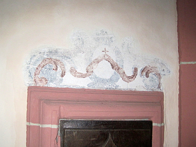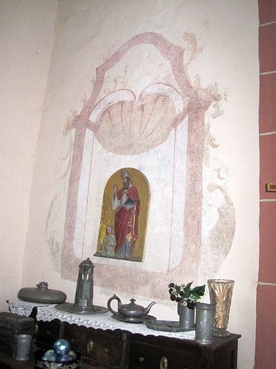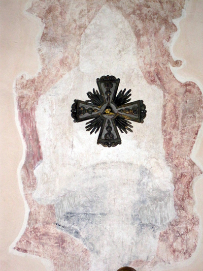 Der Innenraum verbaut, im Chor befinden sich Freskenreste. [1]