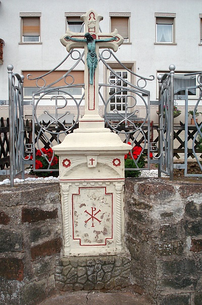 Schlichtes neugotisches Pfeilerkreuz, dessen Kreuz einfach kristalline Formen zeigt. Am Pfeiler von gedrehten Halbsäulen eingefasste, jetzt leere Inschrifttafel; um 1890. Das Wegekreuz steht auch stellvertretend für weitere Kreuzsetzungen, etwa bei Leukstraße 6 von 1894. Nach der Renovierung, hat man einen Gusskorpus und es in heller Farbe verschönert. Das Kreuz steht vor einer Sandsteinbruchmauer in einer Nische, dahinter ein Eisengeländer, mit beiderseitigem PX und nach oben zum Kreuz auslaufender Spitze. [1]