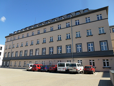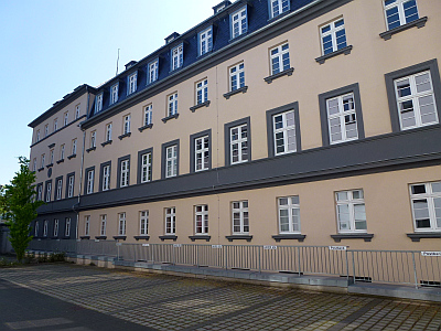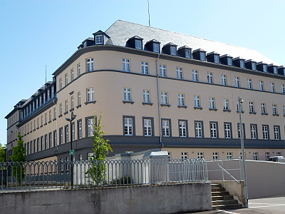 Geschäftsgebäude der ehemaligen Reichsbahndirektion (Christophstraße 1) mit ehemaligem Bediensteten-Wohnflügel (Balduinstraße 6), nach Entwurf des Architekten und Reichsbahnrates Karl Albermann durch die Bauunternehmung Hans Zimmermann 1922-25 errichtet.