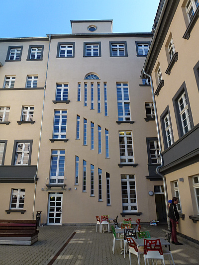 Die zur Deworastraße gelegene Seite bildet eine schloßähnliche Fassade aus, die bis auf die abgerundete Ecke im Südwesten regelmäßig gestaltet ist: Die beiden viergeschossigen, abgewalmten Seitenflügelrahmen einen dreigeschossigen Mitteltrakt mit Mansarddach. Ein an die Nordwestecke anschließendes Portal dokumentiert mit dem Datum 1922-25 die Bauzeit des Gesamtbaues.