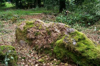 Das Gebüsch ist teilweise gerodet, sodass der total mit Moos bedeckte und zum Teil verwitterte Stein wie ein schlafender Riese aussieht. Man kann zwischen dem Moos einige Quarziteinschlüsse erkennen. Der Stein gleicht einer abgebrochenen Säule, wobei das eine Ende etwas spitz
