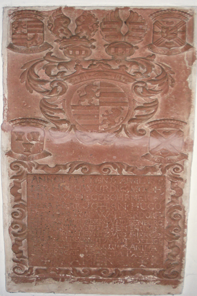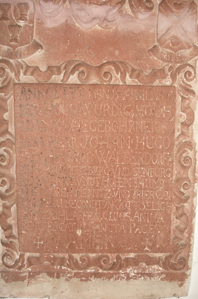 An der Nordseite Epitaph für Johann Hugo Walderdorf († 1737) [Bild 5] mit Wappen und kleinen Ahnenwappen am oberen Teil [Bild 6]. [1]