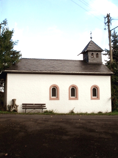 Als gegen Ende des 20. Jahrhunderts das Gemeindehäuschen nicht mehr genutzt wurde (davor war darin die Viehwaage, die gemeindeeigene Unkrautspritze und die Feuerwehrschläuche), beschloss der Grundstücks -besitzer, innerhalb der Mauern eine Kapelle im Stil alter Eifel – Kapellen zu errichten. Dies gelang so gründlich, dass auch Besucher aus der Gegend überzeugt sind, dass diese Kapelle schon immer dort gestanden habe. Rundbogenfenster mit Wasserschlagkante in romanischem Stil. Sandstein und Kalkverputz im Stil des Zahrenhofes (1. Hälfte 18. Jahrhundert) und des Backhauses, die Einrichtung klar und einfach.