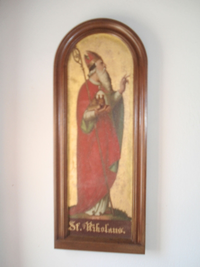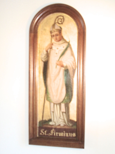 Links und rechts vor dem Sakralraum und Rückwärts über der Eingangstür befinden sich Gemälde von Heiligen, die in diesem Teil der Eifel traditionell verehrt wurden. Sankt Nikolaus (als Bischof, er trägt auf der Bibel einen Beutel mit Geld, mit dem er die Töchter einer Familie "kaufte" und sie vor der Prostitution rettete), Sankt Firminus als Bischof, auf dem Bild über der Tür links Sankt Sebastian als Märtyrer, Sankt Hubertus als Bischof mit der Heiligen Schrift und dem Hirsch, der nach der Legende ein leuchtendes Kreuz zwischen den Geweihstangen trug, und Sankt Rochus als Pilger mit dem Wanderstab, der Jakobsmuschel und der Pestwunde am Knie (der Legend nach kam jeden Tag ein Hund und brachte ihm ein Brot). Ein derzeit nicht ausgestelltes Rundbild der Schmerzhaften Madonna, deren Herz nach einem Wort der Schrift von sieben Schwestern durchbohrt wird, gehört zu dem Gemäldezyklus.
