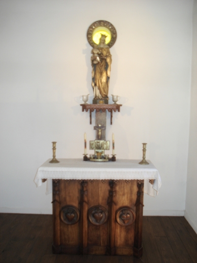 Der kleine Handgeschgeschnitzte Holzaltar stammt aus Brabant (ca. Mitte 19. Jahrhundert) und trägt auf der Vorderseite Mariensymbole: das Herz für die Innigkeit der Gefühle und die Frömmigkeit, die Flammenkrone für die Intensität, links zwei gekreuzten Lilien als Symbol der reinen Tugend (neben der Rose die Marienblume), mittig das durchbohrende Schwert und der Hinweis auf den Kreuztod Jesu, rechts den Rosenkranz. Betstühle aus Köln aus den 1930er – Jahren und einfache handgearbeitete Stühle aus der gleichen Zeit genügen neben dem Notenständer für das Fürbittenbuch und die Opferkerzen (USA, 19. Jahrhundert) als Einrichtung. Ein Friedhofskreuz aus der Mitte des 19. Jh. (Donation Klinkhammer, Neuerburg) und ein kleines Kreuz mit Elfenbeinkorpus aus der Mitte des 18. Jahrhunderts (Donation Dr. Biela und U. Biela) tragen weiter zur stillen, sakralen Atmosphäre des Kapellenraumes bei. Das außen rechts der Eingangstür angebrachte Granitkreuz stammt aus der Pfalz (Donation W. und D. Schmitt)