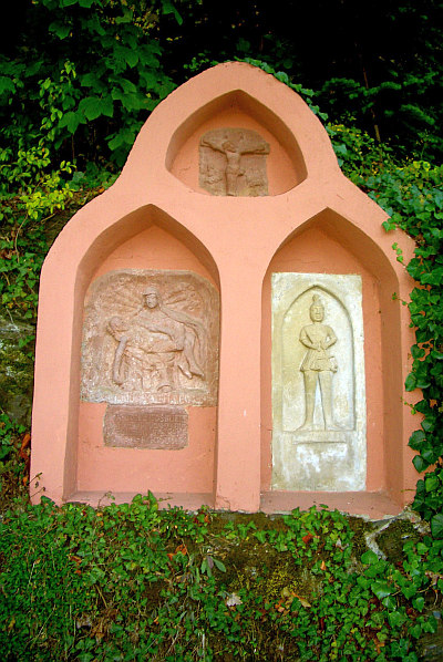 Wenn der von Piesport nach Klausen pilgernde Beter die steile Bergstrecke seines Weges hinter sich gebracht hat, ist er den Stufen des Kreuzweges gefolgt, so kommt er an dem Spoabildchen vorbei, eine kleine Kapelle (die Spoakapelle), die gleich links steht, eine Kapelle auf steilen Felsvorsprung – auf der anderen Wegseite aber ist ein Wegbild in den Felsen eingesetzt, der Volksmund den Namen Spoabildchen führt. Es ist ein dreigeteiltes Wegbild, das früher einmal als ein Bildstock hier errichtet war. Wie es kam, daß es nunmehr als 3 Teile in die Felswand eingesetzt ist, konnte nicht mehr in Erfahrung gebracht werden. Das oberste Bild stellt ein Abschlußkreuz dar und trägt auch noch eine Jahreszahl (1831) und den Namen des Renovators. Johann Matth. Leonard . Der 2. Teil stellt die Gottesmutter dar mit dem Sohne auf dem Schoß. Sieben Schwerter durchbohren ihr Herz. Unter diesem Bild aus rotem Sandstein steht im Stein eingehauen eine Inschrift, welche die Geschichte der Errichtung erzählt.