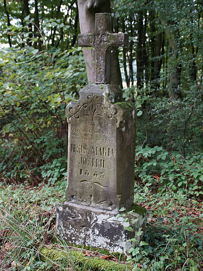 Das Kreuz obenauf misst 0,43 m Höhe, 0,37 m Breite und 7 cm Tiefe. Es wurde aus Beton gegossen und ist mit einem eingelegten Drahtgeflecht versehen, das die INRI Buchstaben wiedergibt. Es ist sicher später ausgeführt worden, da der Beton 1885 nicht üblich war.