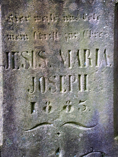Das Wegekreuz trägt zwei Inschriften. Die erste wurde oben eingefügt und ist relativ klein: