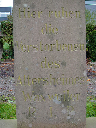 Ein Teil des Zentralfriedhofs in Waxweiler ist der Friedhof der Verstorbenen des Alten- und Pflegeheims "Herz-Jesu". Es wurde vom 27.10.1908 (Einweihung) bis zum 31.12.2008 von den Schwestern vom Heiligen Geist aus Koblenz-Marienhof zunächst als Kinderbewahrschule, Nähschule, Entbindungsstation, Erholungsheim und zuletzt als Alten- und Pflegeheim betrieben. Das Alten- und Pflegeheim steht seit dem Weggang der Schwester aus Waxweiler unter neuer Trägerschaft und hat Platz für 97 Seniorinnen und Senioren. [1]