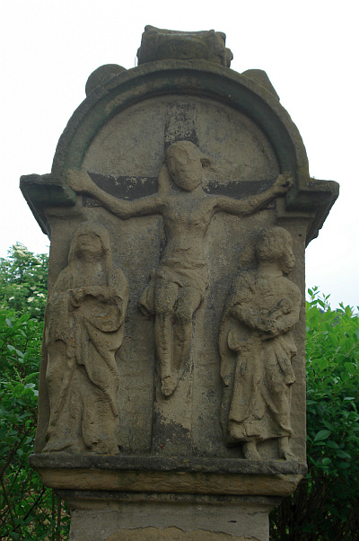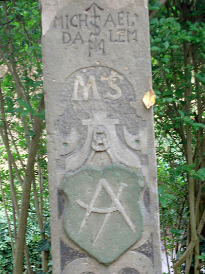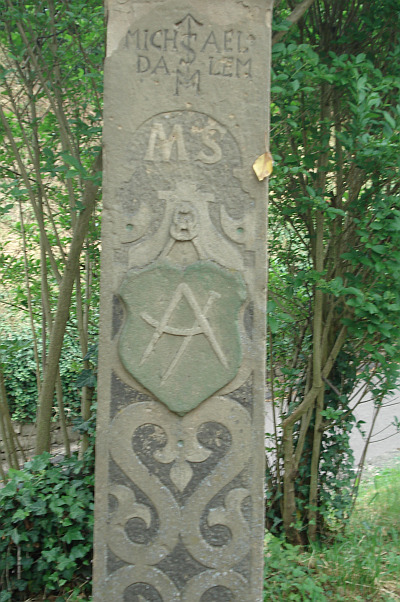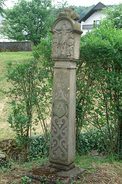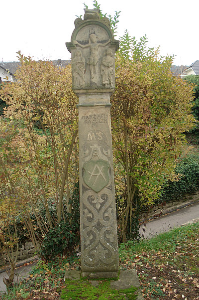 [...] Knapp 2,5 m hoher Kreuzbildstock aus hellem Sandstein. Der untere Teil des kantigen Schaftes und die Seiten des Aufsatzes zeigen gerolltes Beschlagornament. Stilistisch dazu passend ein Wappenschild mit Zirkel und Bootshaken, darüber das sich zweifach wiederholende Monogramm MS bzw. SM, einmal durch Pfeil zum Steinmetzzeichen verbunden und den Stifternamen Michael Dalem trennend. Im Aufsatz fein ausgearbeitetes Kreuzigungsrelief mit Maria und Johannes; vom fehlenden Abschlusskreuz zeugt der von Totenköpfen bekleidete Stumpf. Der in der Mitte des 17. Jahrhunderts zu datierende Kreuzbildstock ist ein ebenso seltenes wie reich gearbeitetes Exemplar. [1]