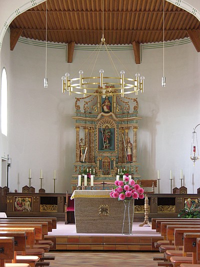 Nach umfangreichen Sanierungs- und Renovierungsarbeiten im Innern stellt die Kirche heute ein Schmuckstück dar. Die Inneneinrichtung stammt zum Teil aus der alten Kirche. Sehenswert sind die aus der Mitte des 18. Jahrhunderts stammenden Altäre mit zahlreichen Heiligenfiguren, die Kanzel aus dem Jahr 1623, die mit Schnitzereien und Figuren verzierte Kommunionbank sowie ein wuchtiger, schwerer Taufstein, der ebenfalls aus der alten Kirche stammt. Ebenfalls sehenswert, aber vor allem hörenswert ist die neue Orgel aus der Werkstatt des Orgelbaumeisters Fasen aus Oberbettingen.