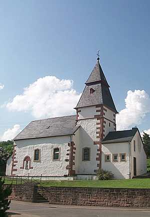 Romanische Kleinkirche des 11. / 12. Jahrhundert mit Ostchorturm. 1789/90 wurde das Schiff etwas erhöht und der Eingang von der Südseite an die Giebelseite verlegt. 1803 wurde die Vorhalle und 1966/67 die Sakristei angefügt. Die kriegszerstörte Schieferkuppel mit Laterne wurde 1958 durch einen vierseitigen Pyramidenhelm ersetzt.