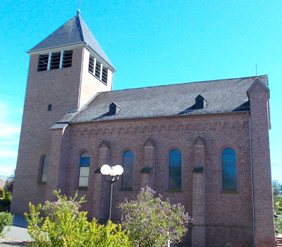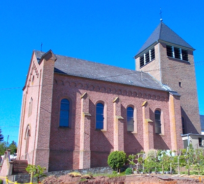 Am Südwestrand des Ortskernes in steil nach Osten ansteigendem Gelände, parallel zur Straße stehend. 1867/68 nach bereits 1862 genehmigten Plänen des Bitburger Kreisbaumeisters Wolff erbaut. Der ganze Bau sehr ähnlich der nur wenige Jahre älteren Kirche in Beilingen. Von der Ausstattung aus der Bauzeit nur die Kanzel erhalten, aus der alten Kirche stammen die beiden Seitenaltäre des 18. Jahrhunderts. [1]