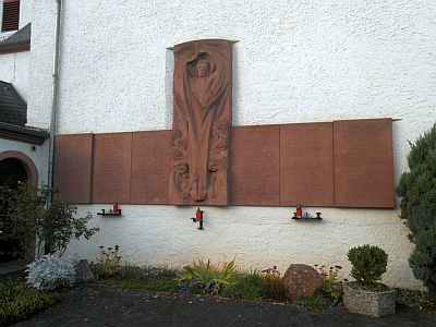 Das Gefallenen-Ehrenmal an der Kirchenfront wurde am 23.11.1958 eingeweiht. Es wurde geschaffen von dem Bildhauer Scherl aus Wittlich, und wurde durch Spenden finanziert. Es sind 102 Tote namentlich genannt. 26 Gefallene aus dem Ersten Weltkrieg und 76 Gefallene und Vermisste sowie Ziviltote aus dem Zweiten Weltkrieg.