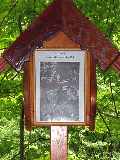 Kreuzweg mit 15 Stationen entlang des Lorscheider Baches als Geschenk zur 800-Jahr-Feier der Gemeinde. Die Stirnbretter wurden aus alten Kirchenbänken gefertigt. [1]