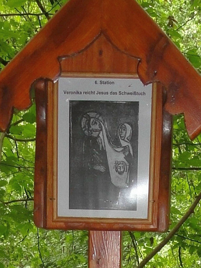 Kreuzweg mit 15 Stationen entlang des Lorscheider Baches als Geschenk zur 800-Jahr-Feier der Gemeinde. Die Stirnbretter wurden aus alten Kirchenbänken gefertigt. [1]