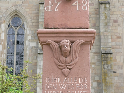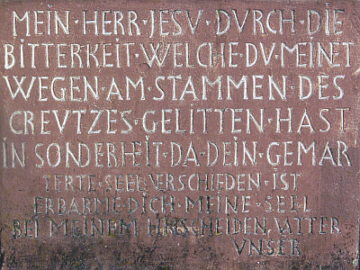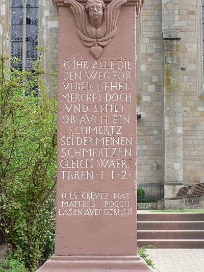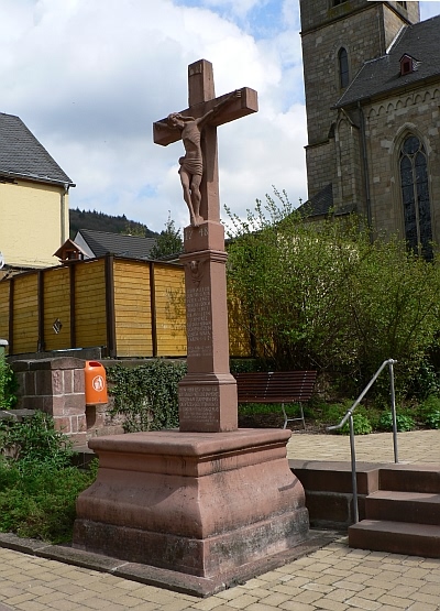 Schlankes, knapp 4 Meter hohes Sandsteinkreuz auf einem altarartigen, geschweiften Sandsteinsockel. Der hohe Pfeilerschaft mit verschiedenen, sich auf den Kreuzestod beziehenden Inschriften sowie der Nennung des Stifters Matheis Posch. Das fast gleichhohe Kreuz trägt einen fast vollplastischen Sandsteinkorpus und am Kreuzesfuß die Datierung 1748. Das wahrscheinlich auf dem Sockel für einen der im 17. Jahrhundert errichteten Fußfälle aufgestellte Kreuz dürfte ausweislich der ungewöhnlichen Durcharbeitung und der Inschriften eine kunstvolle Erneuerung des 19. Jahrhunderts darstellen.