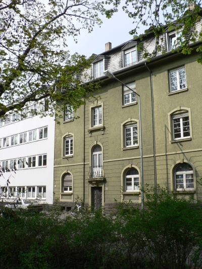 Dreiteiliges, traufständiges Reihenhaus mit ursprünglich zwölf Wohnungen für Offiziersfamilien der französischen Besatzungsmacht, nach Entwurf des Trierer Reichsneubauamtes I von 1922 erbaut und 1924-25 fertiggestellt. Die Wohnanlage bildet zur Straße drei, von einer ausgebauten Mansarddachhälfte übergriffene Geschosse aus. Die rückseitige Ausbildung von drei mächtigen, polygonalen und jeweils in der Treppenhausachse angeordneten Standerkern diente zur Aufnahme einer Küche, eines Bedienstetenzimmers und eines Bads in jedem Geschoß. Dies ermöglichte die paarweise Anordnung von vier, zusammen über 90 qm großen Hauptzimmern seitlich des Treppenhauses und der Mitteldiele in jeder Wohnebene. Der für ein Reihenhaus beachtliche Wohnungszuschnitt blieb allerdings nur vereinzelt unverändert. Alle drei Treppenhäuser sind erhalten.