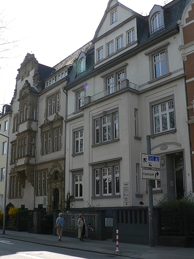 1912 von Jacob Reiter für den Kaufmann P Meyer erstelltes Wohnhaus im Reformstil. Dreigeschossiger Mansarddachbau. Einige antikisierende Details (dorische Säulen der Erkerfenster) verraten Anklänge des Neuklassizismus. Die ursprüngliche Raumaufteilung erhalten. Zeitgemäß ist die geräumige zentrale Diele, von der sowohl der straßenseitige Salon als auch das Wohn- und Eßzimmer mit Wintergarten erschlossen werden. Charakteristisches Beispiel für die reformerischen Bestrebungen der Architektur dieser Zeit, die auf historisierende Formen weitgehend verzichten und Baudekor nur sparsam einsetzen. [1]
