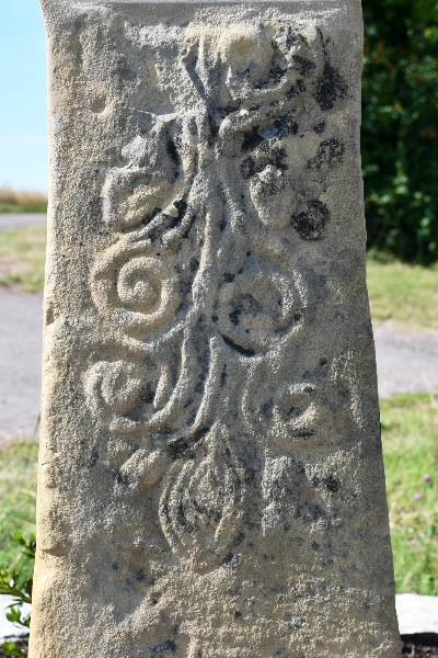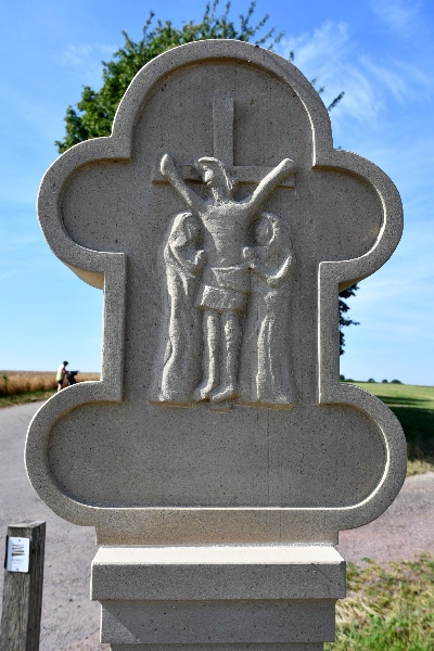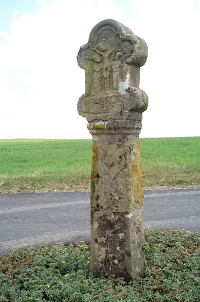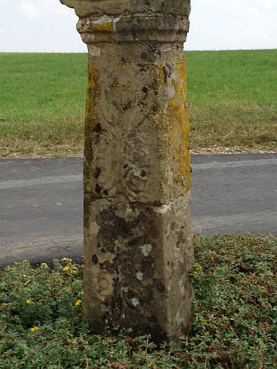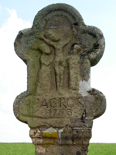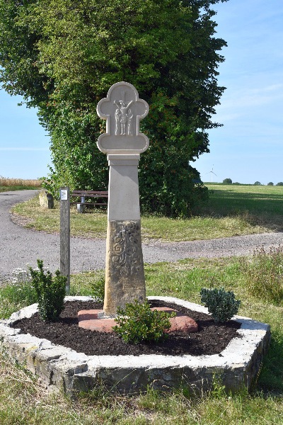Auf Setzstein stehender konisch zulaufender hoher Sandsteinschaft, dessen Vorderseite verwittertes Rankenwerkornament trägt. Darüber auf abgerundetem kapitellartigem Sattelstein (bezeichnet GROS 1753) das kleeblattförmige, erneuerte Abschlusskreuz mit Kreuzigungsdarstellung in Flachrelief. Der Schaft wohl älter und identisch mit dem sogenannten Pestkreuz von 1634. [1]