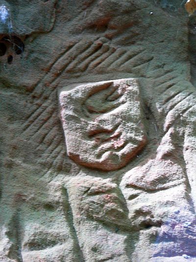 In den Fensteröffnungen der Etage, sowie außen an der Westseite sind primitive, entfernt an Totenmasken erinnernde Gesichter erkennbar. Sie dienten wohl exorzistischen Zwecken. Böse Geister sollten ferngehalten werden.
