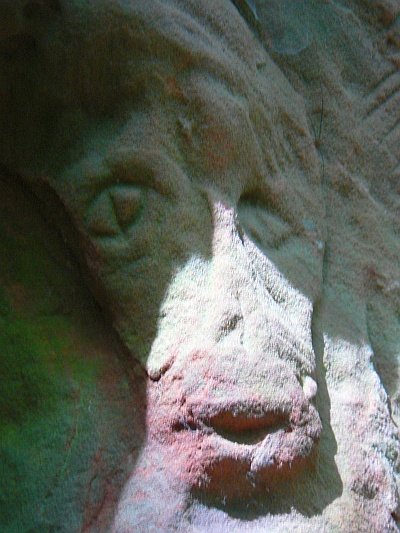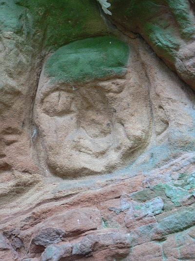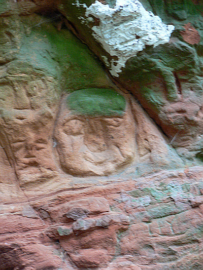 Die Herrichtung der Höhle zu Wohnzwecken, im Sinne der Lebensweise des Einsiedlers, erforderte eine Menge Arbeit. Im Innern bemerkt man in etwa zwei Meter Hohe in gleichem Abstand beiderseitig eingehauene Balkenlöcher, die eine Decke trugen. Sie sind in der über zehn Meter tiefen, sich verjüngenden Höhle fortgeführt und lassen eine Unterteilung des Innenraums vermuten. Der obere Nischenraum diente als geschützte Schlafstätte des Einsiedlers. Der Schlafraum war mit einer Leiter zu erreichen. Die Nische unter dem Etagenraum war offensichtlich zu einem Andachtsraum hergerichtet. Eine Rundbogennische, mit einem Strahlenkranz verziert, ist in den geglätteten Felsen eingehauen. Ein natürliches Loch in der Außenwand des Felsens ist zu einer wohlproportionierten Fensteröffnung gestaltet. Die in der Fensteröffnung und außen in der Westseite eingemeißelten primitiven Gesichter erinnern an Totenmasken. Rechter Hand vom Höhlenausgang sind gleichfalls in die vorspringende Felsensäule eine große Anzahl von Fratzen aller Art eingehauen.