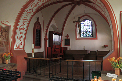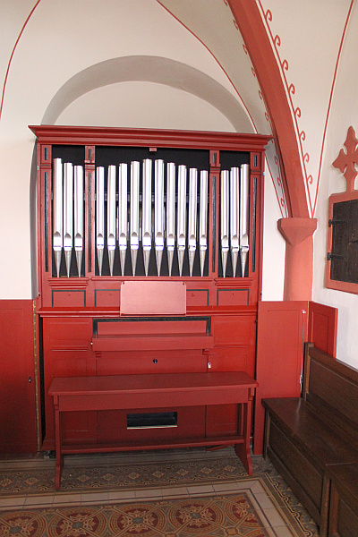 Der Torbogen, in dem die Orgel steht, war früher der Durchgang zu der jetzt nicht mehr vorhandenen Sakristei. [2]