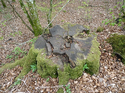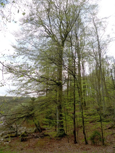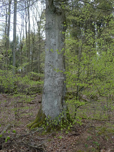 Rotbuchen - Fagus sylvatica. Die beiden Buchen stehen am Fahrweg zur Eishöhle unmittelbar nebeb dem nördlichen Rand der Abbaufläche im "Rother Kopf". Stammumfang: 2,05 und 2,18 m. Geschätztes Alterbei Unterschutzstellung: 100 Jahre [2]