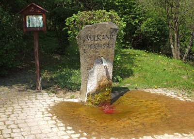 Die Vulkan-Quelle ist Teil der Minralquellen im Dreiser Weiher. Hier befindet sich die Abfüllanlage der "Nürburg-Quellen". Von Daun über die B421 in nördlicher Richtung, ca. 10 km, hinter dem Ortsausgang im Dreiser Weiher. Direkt hinter der Abfüllanlage an der Dreiser Mühle führt ein Fussweg in den Maarkessel. Nach ca. 200 m liegt die Quelle an der kleinen Kapelle. Das Wasser hat mit den stärksten Mineraliengehalt aller Eifelquellen, dabei schmeckt es aber sehr angenehm und nur wenig nach Eisen oder Schwefel.