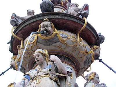 Als Steinmetzen sind Meister Nicias, Matthias Windersdorf, Hans Eiffel und Dietz von Pallien überliefert. Zahlreiche Renovierungen (1724, 1753, 1820, 1865, 1904, 1938) haben die Authentizität der ursprünglich farblich gefassten und teilvergoldeten Brunnenarchitektur stark beeinträchtigt. 1983 erfolgte die letzte, gründliche Restaurierung (Farbfassung, Gitter und kleines, seitliches Überlaufbecken erneuert).