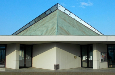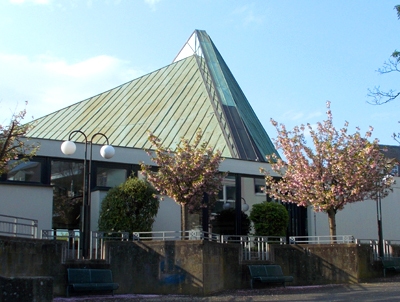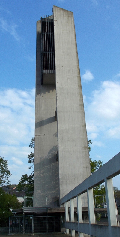 Kirche aus dem Jahr 1961 auf den Resten einer spätrömischen Villa, erbaut als "Zelt Gottes unter den Menschen" durch Architekten Hermann Baur, Altar in der Kirche und der Krypta gestaltet von Georg Meistermann, Reste der Villa in der Krypta erhalten. [1]