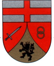Unter silbernem Schildhaupt, darin ein rotes Balkenkreuz, durch eingeschweifte goldene Spitze, darin ein schwarzer Löwe, gespalten: vorne in Rot ein silbernes Schwert nach links, hinten in Rot zwei ineinander geschwungene goldene Ringe.