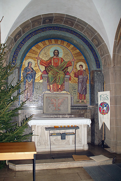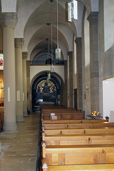 Querhauslose Säulenbasilika mit Krypta, Architekt Peter Marx, 1912–15, bildhauerischer Schmuck von Willy Meller und Heinrich Müller, Köln, reiche Ausstattung; zugehörig eingefriedeter Kirchenvorplatz, Pfarrhaus (Maarstraße 72) und Gemeindehaus mit Küsterwohnung (Kloschinskystraße 2), Mansardwalmdachbauten, Reformarchitektur. [1]