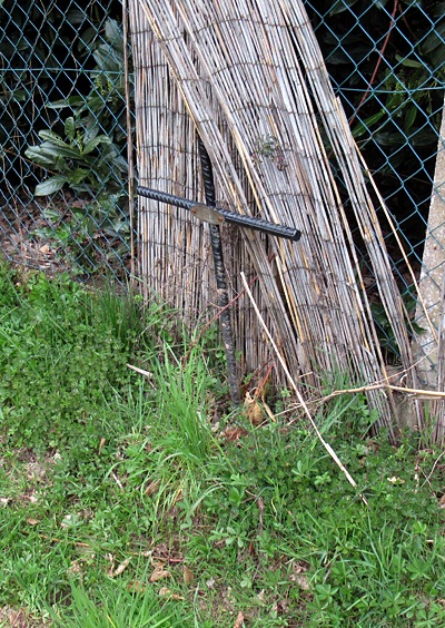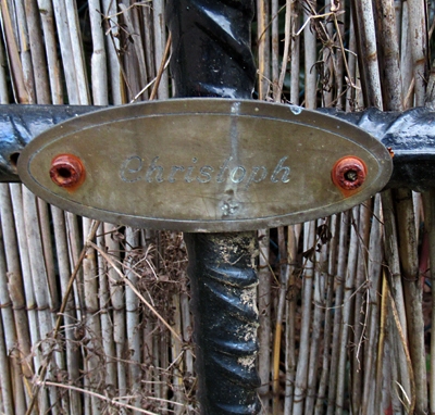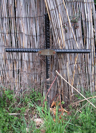 Schlichtes Eisenkreuz mit Plakette "Christoph" am Wegesrand. [1]