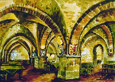 Das Kreuzgewölbe, die Gurtbögen und die Pfeiler sind typisch für die romanische und frühgotische Baukunst. Die Kellerräume dienten ursprünglich als Handelslager zur Aufbewahrung von Wollballen. Später wurden sie als Weinkeller benutzt.