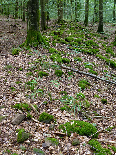 Abschnitt der spätrömischen Langmauer, einer rund 72 Kilometer langen, nördlich von Trier wohl von (paramilitärischen Einheiten unter Valentinian (364-375 n. Chr.) errichteten Schutzmauer eines kaiserlichen Domänenbezirkes (circa 220 Kilometer²). Die Mauer erreichte eine durchschnittliche Breite von 0,60 Meter und war in diesem Bereich durch in alternierender Folge auf je 25 Fuß (circa 7,40 Meter) angelegte Lisenen oder Stützpfeiler von 0,40-0,48 Meter Breite und bis zu 0,42 Meter Tiefe verstärkt. Rund 100 Meter südlich konnte 1982 ein Baufehler beobachtet werden, der aus der Beteiligung verschiedener Bautrupps resultierte, die sich aus entgegengesetzten Richtungen ihrem Ziel näherten. Damit war auch der Anfang beziehungsweise das Ende einer in den Bauinschriften genannten Pedaturen [D P = quingenti p(edes) oder p(assus), 500 Schritt oder Fuß] gefunden. Die mit Halbwalzen abgedeckte Mauer umfasste keine fortifikatorische Elemente wie Türme oder Gräben und war kaum höher als 2 Meter gewesen. Daher sollte die Langmauer, die nur waldarme Muschelkalkböden, die fruchtbarsten des Trierer Landes, umschloss, eine Art Wolfsmauer gebildet haben. Der auf diese Weise gegen einströmendes Raub- und Fresswild geschützte Domänenbezirk hatte vielleicht die Versorgung der nahegelegenen Kaiserresidenz im letzten Drittel des 4. Jahrhunderts sicherzustellen. [1]