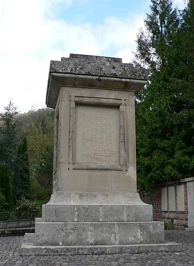 Etwa 5 Meter hoher, grauer Sandsteinquader auf Treppenaufbau; rückwärtig um eine Schauwand für die Gefallenen des Zweiten Weltkrieges erweitert. Denkmal für die im Ersten Weltkrieg Gefallenen der Gemeinde. An allen Seiten Reliefvertiefungen, von denen die Vorderseite einen sterbenden Soldaten mit ihm Eichenlaub reichende Engel zeigt. Das ungewohnt kubisch klare Denkmal wurde in den 1920er Jahren vom Kordeler Steinmetz Josef Schaffner erstellt. [2]