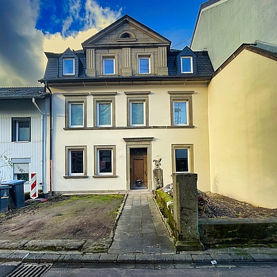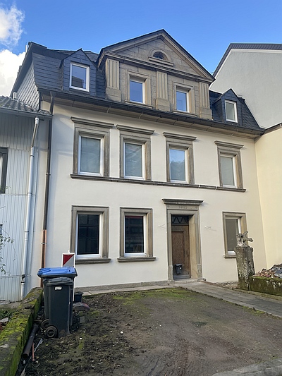 Im Türsturz 1889 bezeichnetes Gebäude, das vom schiefereingedeckten Krüppelmansarddach und einem wohl in den 1920er Jahren aufgesetzten, neuklassizistischen Zwerchhaus dominiert wird.
