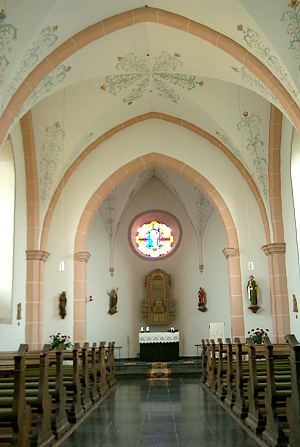 Das Langhaus der Kirche wurde 1846 in Nord-Süd-Richtung an den romanischen Turm angebaut, vermutlich von demselben unbekannten Baumeister, der die Kirche in Kaschenbach entworfen hat. Der Innenraum steht in der Tradition barocker Landkirchen. Von der Ausstattung sind nur die Kirchenbänke mit barock geschweiften Wangen erhalten. In der Turmhalle erinnert eine Grabplatte und der Rest eines Epitaphs an zwei Mitglieder der Familie Cob von Nüdingen, den 1671 verstorbenen Christoffel und den 1699 verstorbenen Philipp Christoph. Die an der Straßenseite erhaltene, mehrfach gebrochene Friedhofsmauer aus Kalksteinen ist im Kern wohl noch mittelalterlich. [1]