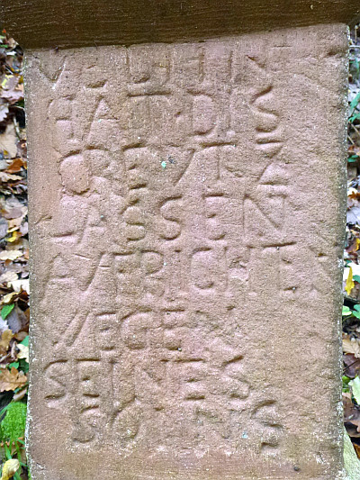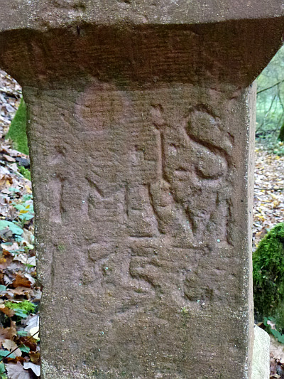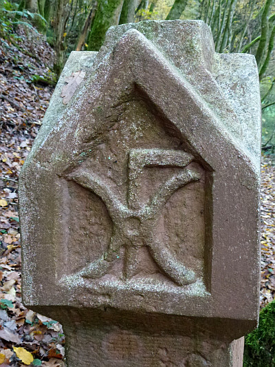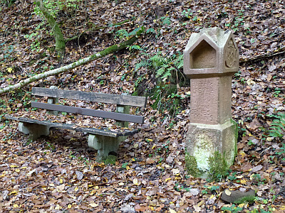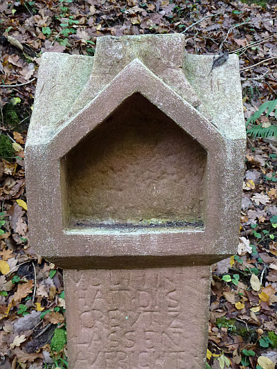Wegekreuz am südwestlichen Gemarkungsrand, über dem Steilhang des Kimmlinger Baches. Massiges Nischenkreuz aus einem gedrungenen Pfeilerschaft auf Sockelstein sowie kreuzdachförmig geschlossenem Nischenaufsatz, dessen aus der Spitze wachsendes Kreuz abgebrochen ist. An den Seitenflächen des Nischenaufsatzes herausgearbeitet sind ein Mühlenhammer und ein mit Hammer, Beil, Zirkel und Winkel belegtes Wappenschild (Berufszeichen Zimmermann). Am Schaft die auf ein Unglückskreuz hinweisende Inschrift mit dem Stifternamen Veitin und die Widmung an dessen (verunglückten) Sohn sowie am Fuß die Datierung 1610. [1]