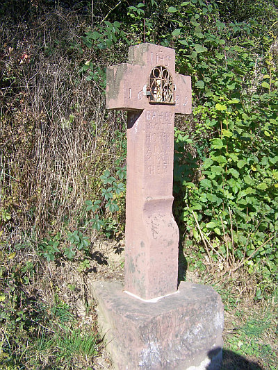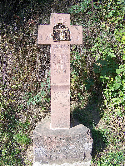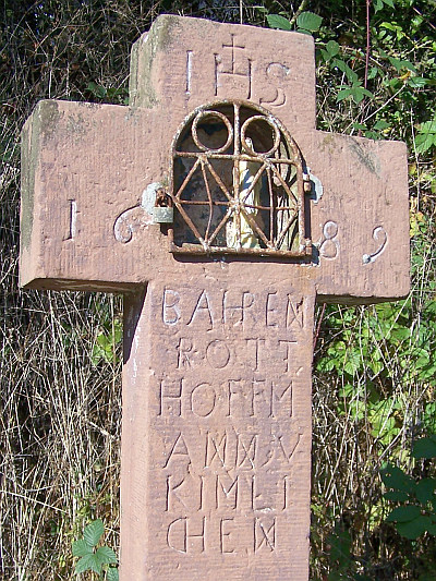 Nordöstlich Kimmlingerhof. Auf Setzstein stehendes Balkenkreuz aus Sandstein mit zwischen den Kreuzarmen ausgearbeiteter Nische. An den Kreuzarmen die Datierung 1689, am Oberteil das IHS-Zeichen und am Schaft die Inschrift:
