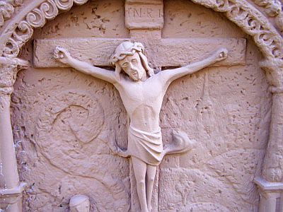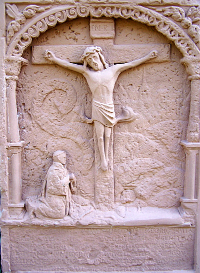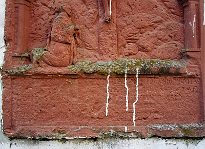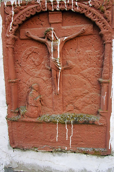 Kreuzigungsbild am Wirtschaftsgebäude. Aufsatz eines Sandsteinbildstocks, jetzt in einer Mauer eingelassen. Fast quadratischer Sandsteinblock mit Kreuzigungsdarstellung in korbbogiger Nische. Seitlich der kniende Stifter mit entfalteter Schriftrolle. Die Inschrift des verwitterten, unter Anstrich liegenden Reliefs nicht lesbar. Qualitätvolle Renaissancearbeit, wohl noch 16. Jahrhundert. [1]